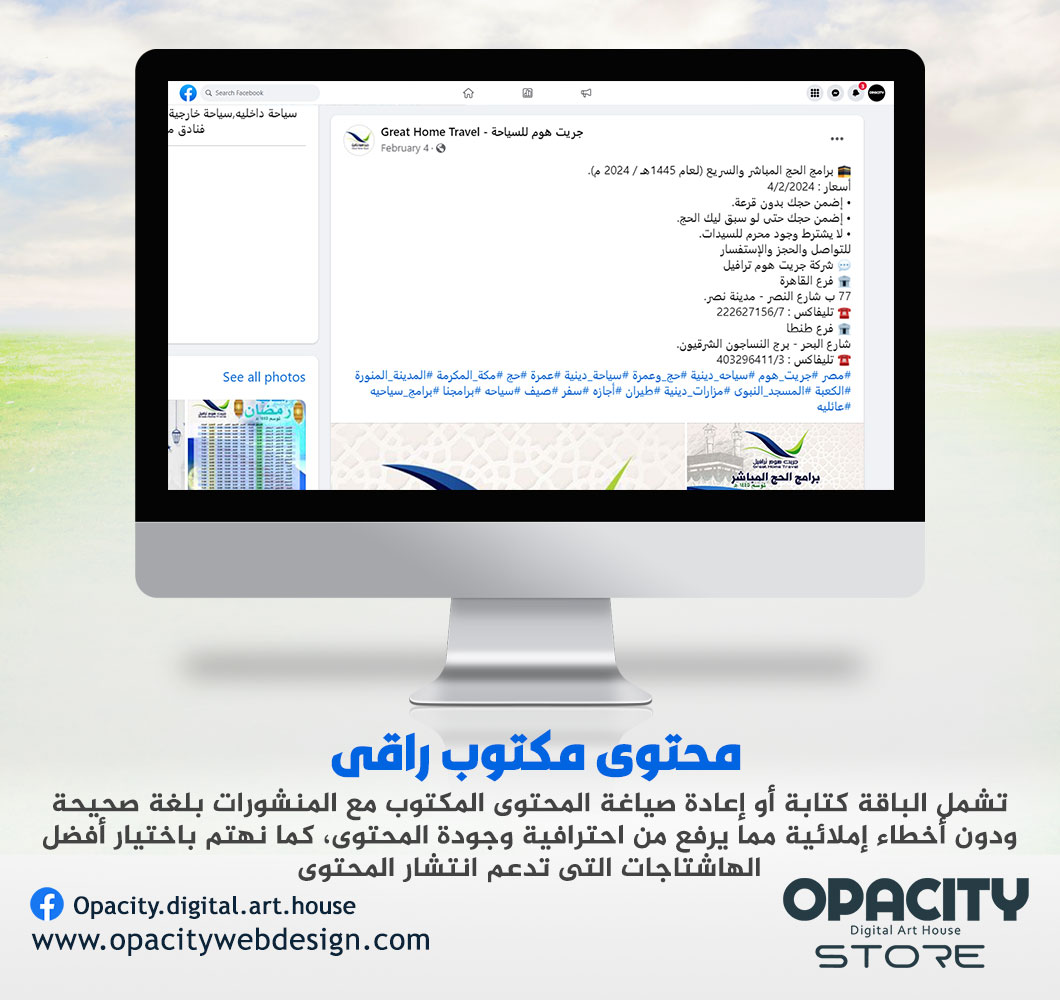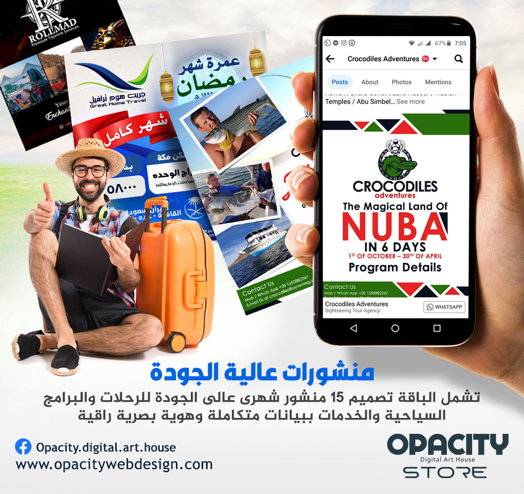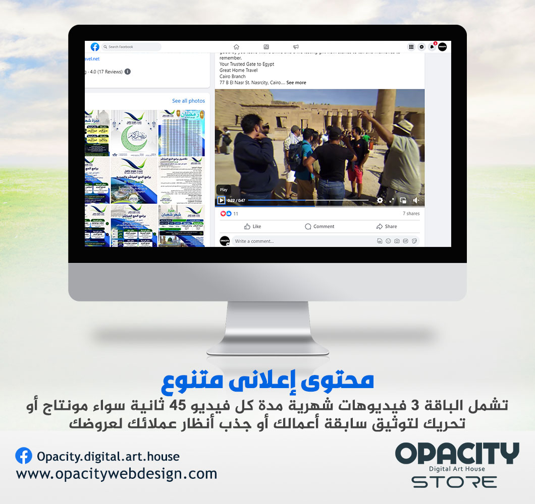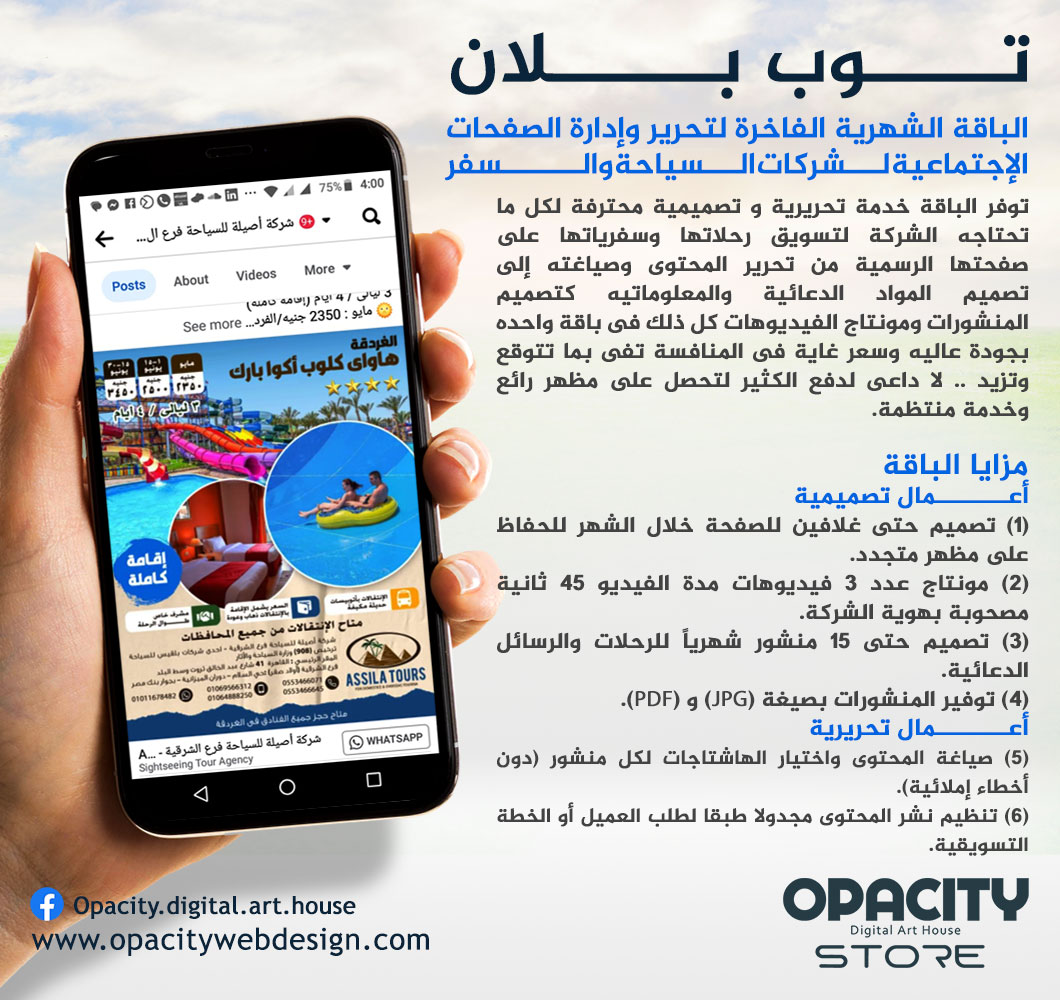 The “Top” travel agencies monthly Plan for managing tourism and travel companies social pages on Facebook, This plan provides all design works the company needs to market its trips and travels, including advertising and information materials, such as designing Posts, offers and videos editing, all in one package with high quality and a very competitive price that meets what you expect and more..